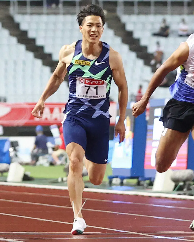 終盤に右足スパイクの靴紐が解け、わずかにバランスを崩した。先行していた多田修平(住友電工)をとらえることはできず、デーデー・ブルーノ(東海大)にも先着を許したが、0秒001差で4位の小池祐貴(住友電工)の追撃をしのぎ、日本男子初となる100メートルでの3大会連続五輪を決めた。