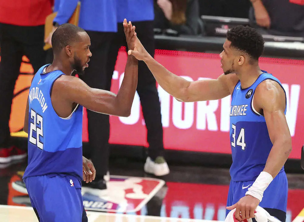 東京五輪の米国代表となっているクリス・ミドルトン(29)が3点シュート12本中6本を成功させ、第4Qでの20得点(チームスコアは30―17)を含むプレーオフ自己最多の38得点と11リバウンド、7アシストをマーク。2018年と19年シーズンのMVP、ヤニス・アデトクンボ(26)はプレーオフでの成功率が56・2%に低下(レギュラーシーズンは68・5%)しているフリースローを13本中7本外したものの(現時点でのプレーオフの成功率は55・1%)、それでも33得点と11リバウンドを稼いでミドルトンとともにチームをけん引した。