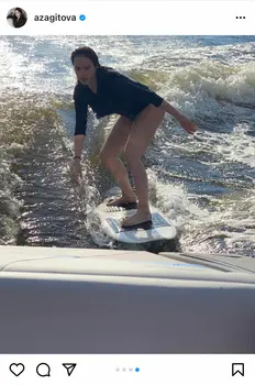 ザギトワは、この日ハートの絵文字などと共に複数枚の写真を投稿。船の上で、笑顔を浮かべリラックスする様子や、ボードに乗り水の上を華麗に滑走している姿を披露した。