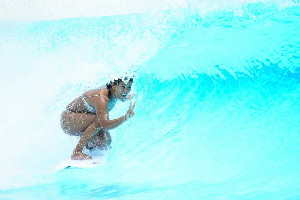 公開された練習では高さや方向の異なる6、7種類の波の状況で、各選手がそれぞれ技を磨いた。自然の海とは違い、効率的に練習できるとあり、都筑有夢路は「反復練習できる。楽しい」と笑顔。