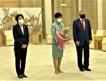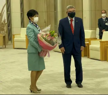 IOCバッハ会長「ハッピーバースデー」69歳誕生日の小池都知事に花束プレゼント