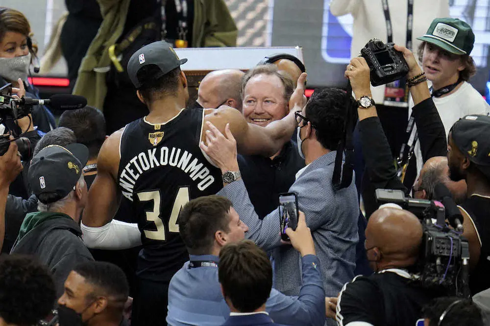 バックスのブデンホルザー監督と抱き合うG・アデトクンボ(AP)