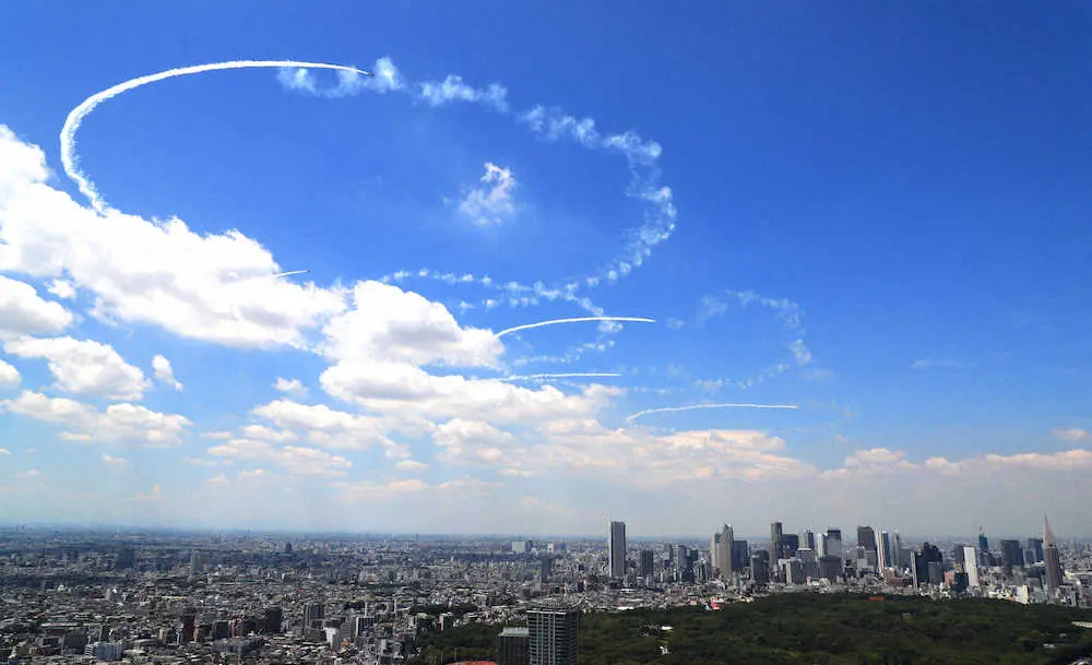 ブルーインパルスが五輪開会式予行フライト、国立競技場付近上空に5つの輪