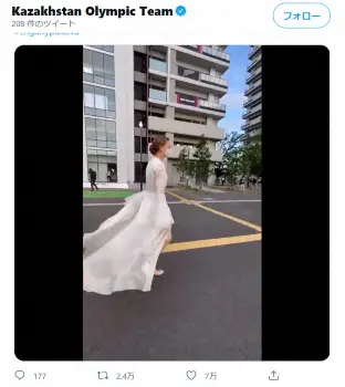 同委員会のツイッターでもリパコワが、まさにはばたく鳥のように開会式前にドレスの裾や袖を風にたなびかせて歩く姿などを公開した。