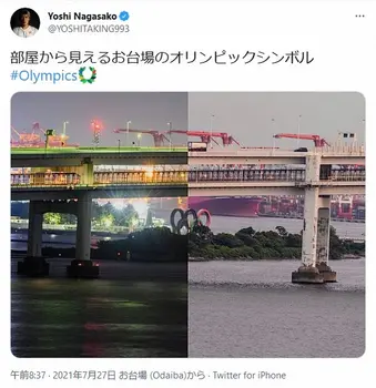 「部屋から見えるお台場のオリンピックシンボル」とつづり、自室から撮影した風景を投稿。お台場に設置された五輪のシンボル、5つの輪が綺麗にライトアップされており、幻想的な1枚になっている。最後は「#Olympics」とハッシュタグを添えた。