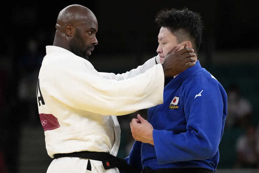 男子100キロ超級3位決定戦 原沢久喜(右)は前回2016年リオ五輪同級決勝で敗れたテディ・リネールに延長戦の末、指導3つの反則負けを喫して敗れたが、試合後は健闘をたたえ合う(AP)