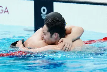 <東京五輪・競泳>男子200メートル個人メドレー決勝、レースを終え健闘を称え合う瀬戸大也(右)と萩野公介(撮影・小海途 良幹)