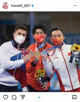「昨日男子個人総合でオリンピック金メダルを獲得することができました!」とあらためて金メダルを報告。「獲得することができたのは家族の支え、今まで指導してくださった方々、私に携わってくれた方々のおかげだと思います。また、東京オリンピックを開催するにあたりIOC、JOCをはじめとする携わった方々、会場や選手村でボランティアを行なっている方々に感謝しかありません」と周囲や大会関係者に感謝しつつ、「この状況下の中で私は1人でも多くの方が開催して良かったと思っていただけたら嬉しいです。祝福のメッセージも寄せられて私は多くの人に応援してもらっていると感じ、自分のことのように喜んでもらえてることが嬉しいです!」と表彰台での3ショットとともに喜びをつづった。