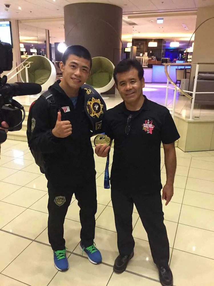 17年世界選手権で日本グレコ勢34年ぶりの金メダルを獲得した文田(左)と父・敏郎さん(敏郎さん提供)