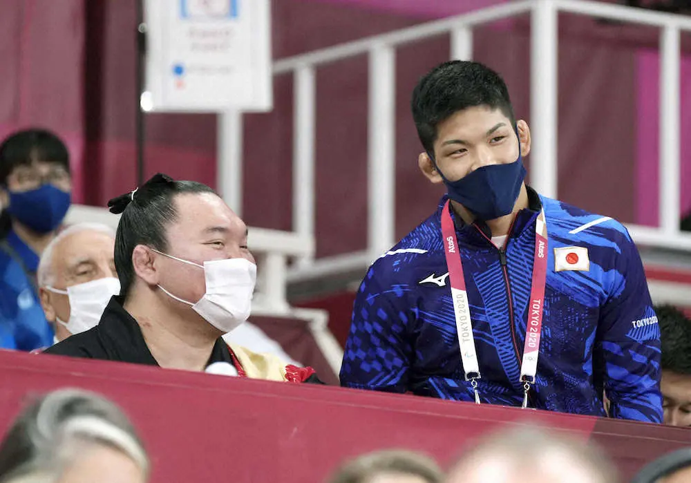 7月27日、東京五輪の柔道会場を訪れ、大野将平(右)と言葉を交わす大相撲の横綱白鵬関=日本武道館