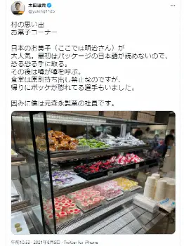 「村の思い出、お菓子コーナー。日本のお菓子(ここでは明治さん)が大人気。最初はパッケージの日本語が読めないので、恐る恐る手に取る。その後は噂が噂を呼ぶ。食堂は原則持ち出し禁止なのですが、帰りにポッケが膨れてる選手もいました。因みに僕は元森永製菓の社員です」とつづり、お菓子が山のように積まれた選手村内のお菓子コーナーの写真を投稿した。