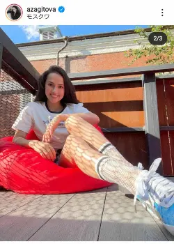 ザギトワ Tシャツ、ショーパン&網ソックス姿で笑顔 「太陽そのもの」「五輪の女王」「素敵」の声