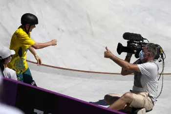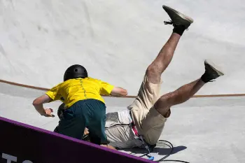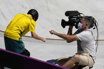 スケートボード男子パーク予選で、選手が撮影中のテレビカメラマン男性に正面衝突し、ヒヤッとさせた後に心温まるシーンがみられた。