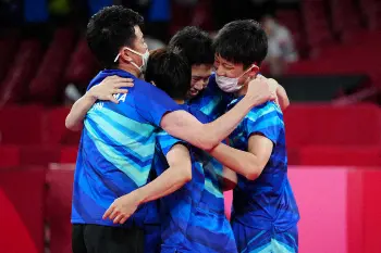 団体3位決定戦で、日本男子は韓国に3―1で勝ち、銅メダルを獲得した。16年リオデジャネイロ五輪の銀メダルに続く2大会連続の表彰台。前回大会も指揮を執った倉嶋洋介監督は、勝利を決めた水谷隼とコート上で抱き合った。その後、張本、丹羽も混じって4人で肩を組んで喜びを分かち合った。