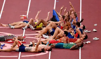 「キング・オブ・アスリート」を決めるといわれる十種競技はダミアン・ワーナー(カナダ)が五輪新記録となる9018点で金メダルを獲得。2日間で文字通り10種目を競う過酷な競技ゆえにレース後は選手たちが友好的に称えあうことで有名。今回はトラックに描かれた五輪マークのコース上にワーナーら金、銀、銅のメダリストを囲むように寝そべり記念撮影。