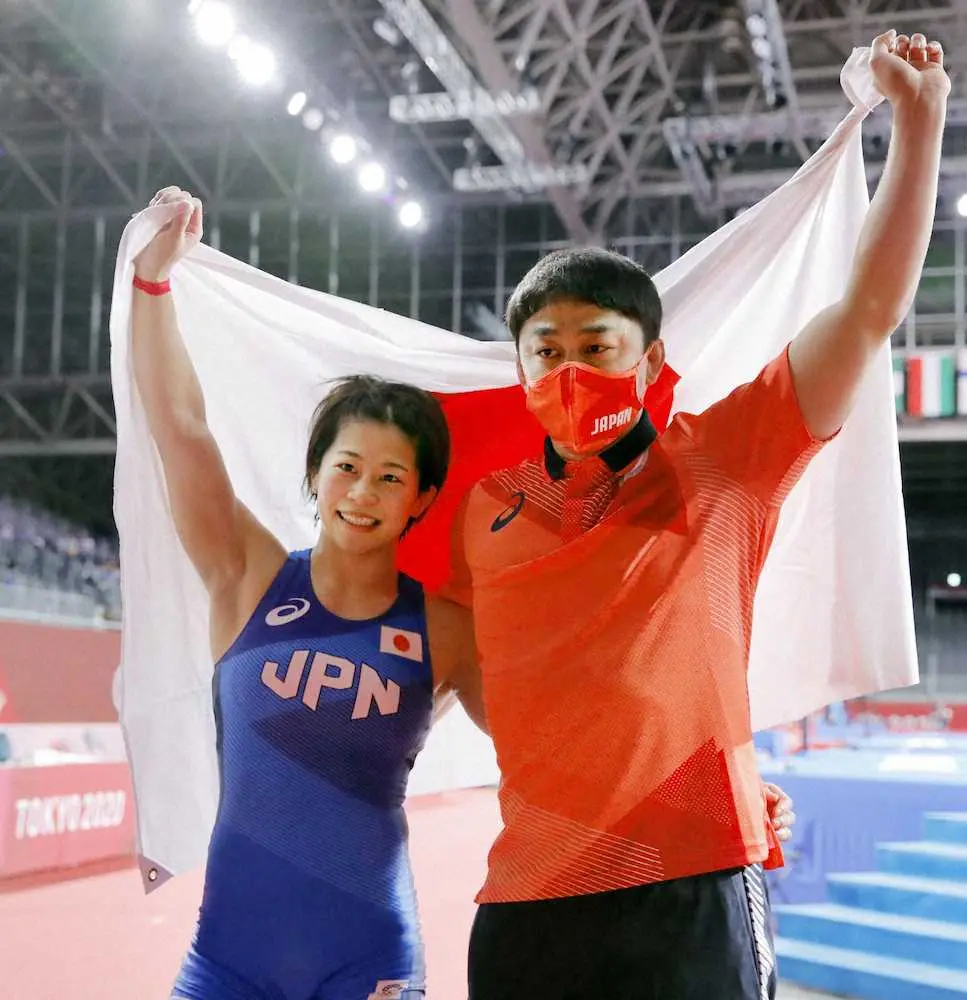 女子53キロ級で優勝し、婚約者の志土地翔大コーチ(右)と日の丸を掲げる向田真優=幕張メッセ