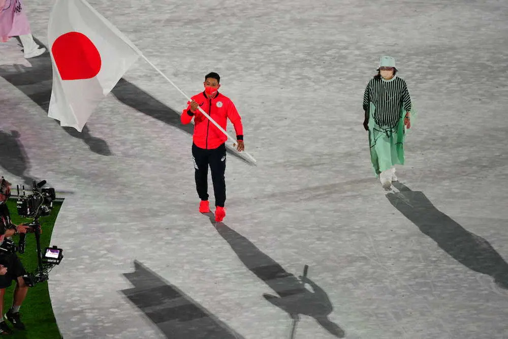 選手団入場に先立って行われた日本国旗の入場では、柔道金メダリストの高藤直寿、競泳2冠の大橋悠依ら3人のメダリストの他に24年パリ五輪で採用されるブレイクダンスで代表入りを目指す河合来夢(らむ)がベアラー(運ぶ人)として参加した。