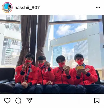 「今日でオリンピック閉幕です。改めて大会関係者、ボランティアの方々、応援してくださった方々、コロナ禍の中海外から来てくださった選手・コーチの方々に心から感謝します」と記し、団体総合で銀メダルを獲得したメンバーの萱和磨(24=セントラルスポーツ)、谷川航(25=同)、北園丈琉(18=徳洲会)との4ショット写真を投稿した。