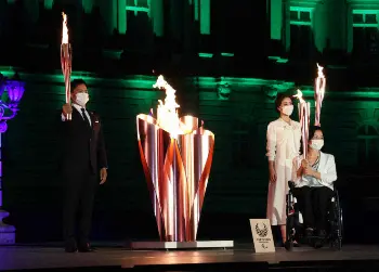 集火式では全国からの火をともしたトーチが登場。火が上空で1つになるイメージ映像が流れたあと、聖火リレー公式アンバサダーを務める柔道男子五輪3連覇の野村忠宏氏、パラリンピック3大会連続出場の田口亜希さん、女優の石原さとみの3人がトーチで聖火皿に点火し、聖火が“誕生”した。2年9カ月にわたるアンバサダーの大役を終えた石原は「とても勇気のいる役目だったが、心からやってよかった。学びがあった時間で貴重な経験をさせていただいた」と感謝を述べた。