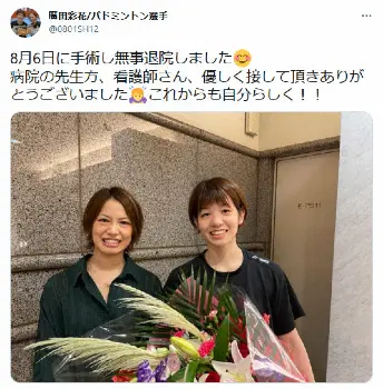 バドミントン・女子ダブルス世界ランキング1位で東京五輪に出場した広田彩花(27)が21日までに自身のツイッターを更新。断裂していた右膝前十字じん帯の手術を終え、退院したことを報告した。