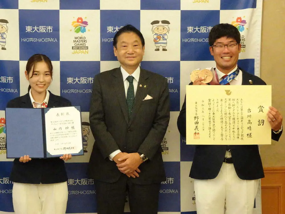 東京五輪のアーチェリーで、団体と個人で計2つの銅メダルを獲得した男子の古川高晴(36=近大職)が23日、女子代表の山内梓(あずさ、22=近大職)とともに東大阪市役所を訪問し、市から表彰を受けた。