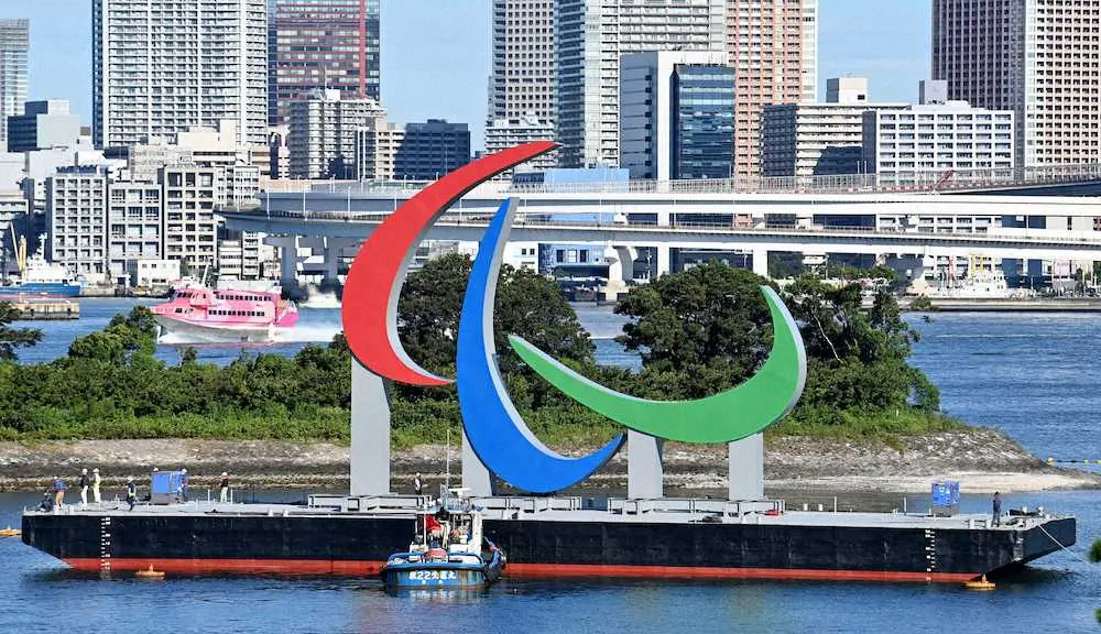 お台場海浜公園の海上に到着したパラリンピックのシンボルマーク「スリー・アギトス」