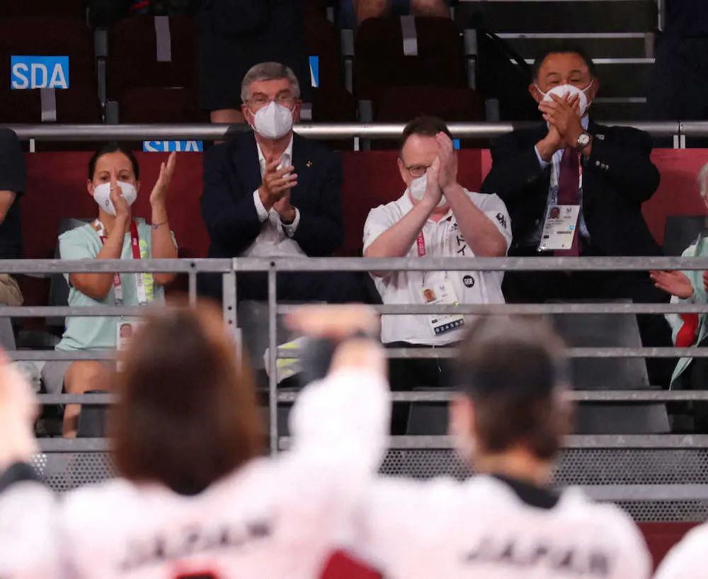 国際オリンピック委員会(IOC)のトーマス・バッハ会長が25日、千葉・幕張メッセで行われた東京パラリンピック・ゴールボール女子の日本―トルコ戦を客席から観戦した。日本オリンピック委員会(JOC)の山下泰裕会長らとハーフタイムに現地に到着。マスク姿で時折、山下会長と話しながら試合を見つめ、試合後に日本チームが会場に向かって一礼すると、席から拍手を送った。その後は、関係者に頼まれて記念撮影を行うなど満喫していた。