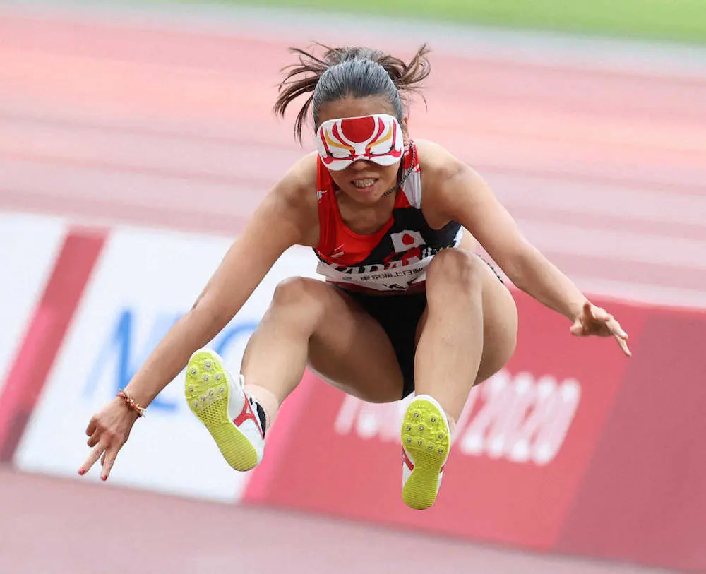 歌舞伎柄のアイマスクの裏に書かれた家族からのメッセージに支えられながら跳躍した。「少しずつ記録は更新できている。メダルを獲れるまで頑張りたい」と3年後のパリへ気持ちを切り替えた。