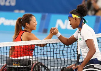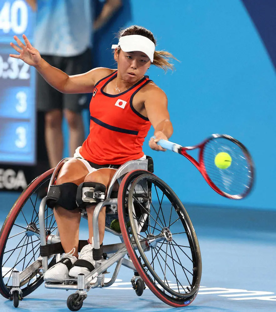 東京パラリンピック第7日 車いすテニス・女子シングルス2回戦 上地結衣(三井住友銀行) 6―0 6―0 デュバル(ブラジル) ( 2021年8月30日 有明テニスの森公園 )