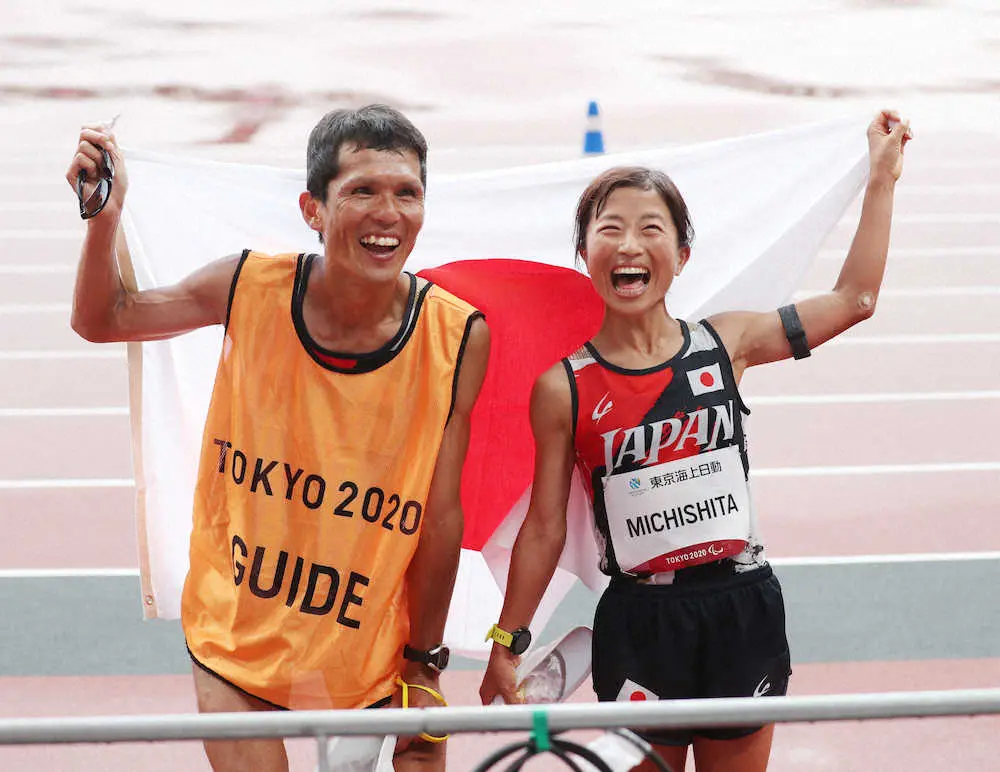 この日は前半を伴走した、同じ東海大出身の青山由佳さん(35)と交代すると、リズムを崩さないようリード。30キロすぎで2位のロシア選手を引き離しにかかると英語で「テン(10)メーター!トゥエンティー(20)メーター!」と叫び始めた。道下は「急に英語でしゃべり始めてびっくりした」というが、志田さんは「差が開いていることを相手に聞こえるようにした」と視覚障がいのレースらしい“テクニック”も見せた。