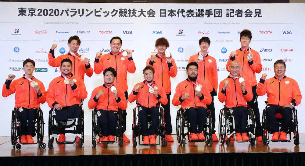 記者会見を終え、銀メダルを手に笑顔を見せる車いすバスケットボール男子日本代表
