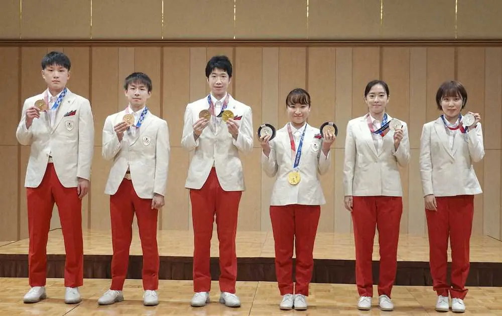 ほかの代表選手にも規定により報奨金を贈呈。混合ダブルス金、男子団体銅の水谷隼(32=木下グループ)には600万円が贈られた。
