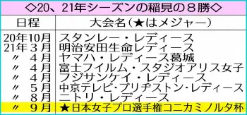 ☆シーズン8勝 稲見は、コロナ禍の影響で1シーズンに統合された20~21年の8勝目を挙げた。シーズン8勝は、03年の不動裕理の10勝(24試合出場)に次ぐツアー歴代単独2位。