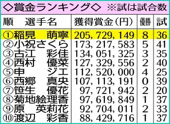 ☆シーズン獲得賞金2億円突破 稲見の20~21年の獲得賞金は2億572万9149円となった。女子で2億円超えは15年に2億3049万7057円を稼いだイ・ボミ以来ツアー歴代2人目。同年のイ・ボミは32試合に出場し7勝した。