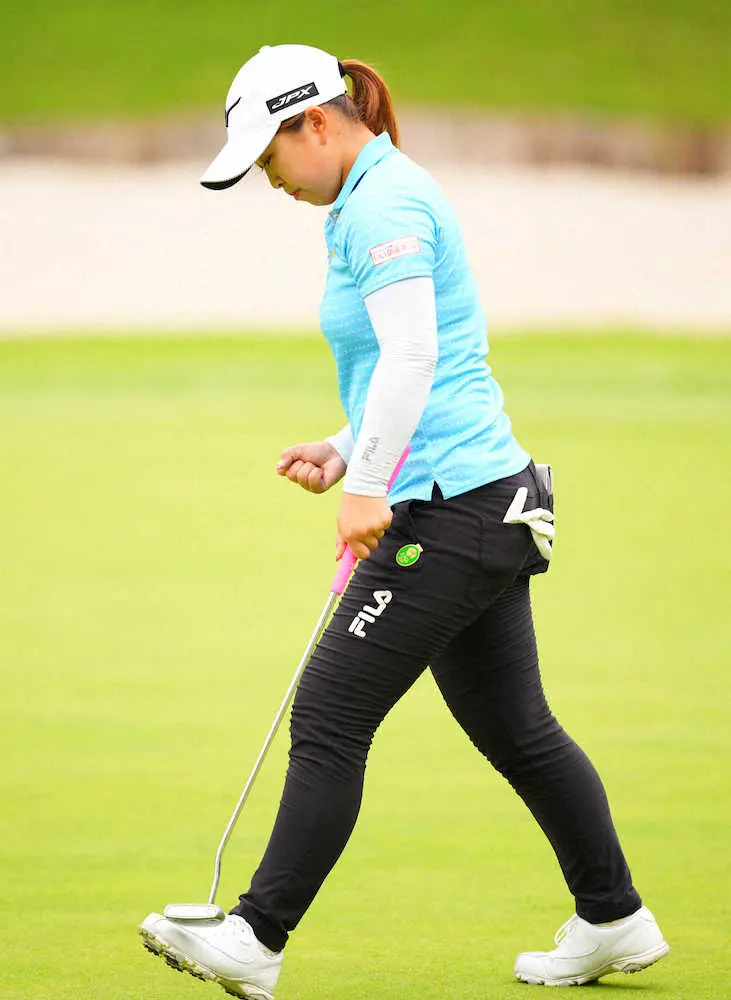6番、バーディーパットを決めガッツポーズの西郷真央(撮影・西尾 大助)