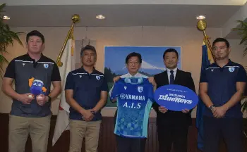 ラグビー静岡ブルーレヴズが静岡県知事を表敬訪問 五郎丸CRO、新たな挑戦へのやりがい強調