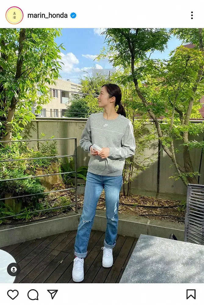 髪を後ろでまとめ、長袖のTシャツに珍しいダメージデニム、白いスニーカー姿で横顔のショットを投稿。20歳を迎えた8月下旬にはフォロワー数も100万人を突破の本田。ストーリーズでは正面を向き笑顔の写真も投稿している。