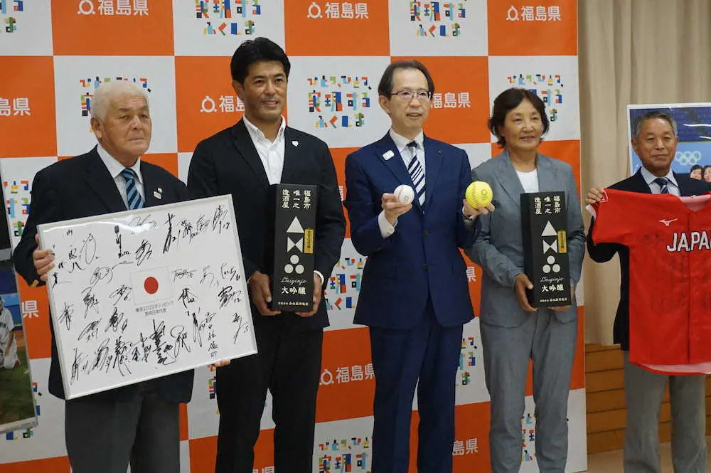東京五輪でともに金メダルを獲得したソフトボールの宇津木麗華監督(58)と、侍ジャパンの稲葉篤紀監督(49)が16日、初戦の舞台だった福島県営あづま球場で、内堀雅雄県知事を表敬訪問した。