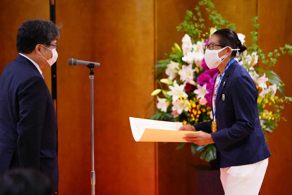 東京五輪パラリンピックにおける文部科学大臣顕彰・表彰式典が21日、都内の旧文部省庁舎で行われ、ソフトボールの金メダル獲得に貢献したエースの上野由岐子投手(39=ビックカメラ高崎)も出席した。