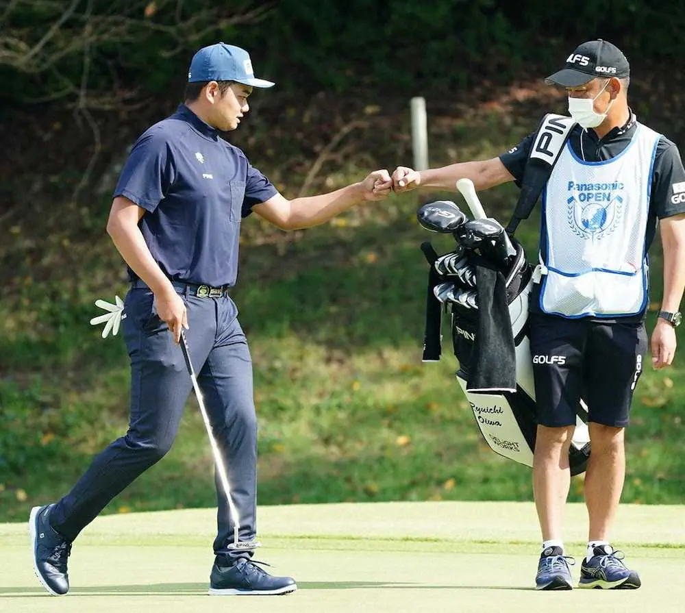 <パナソニックOP・第2日>1番、バーディーを決め門田キャディーとグータッチする大岩龍一(撮影・井垣 忠夫)