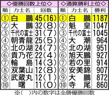 ☆年間最多勝 86勝(4敗)を9、10年に記録。2位は朝青龍の84勝(05年)。9年連続(2位は大鵬ら5年連続)、通算10回(2位は北の湖の7回)も最多。