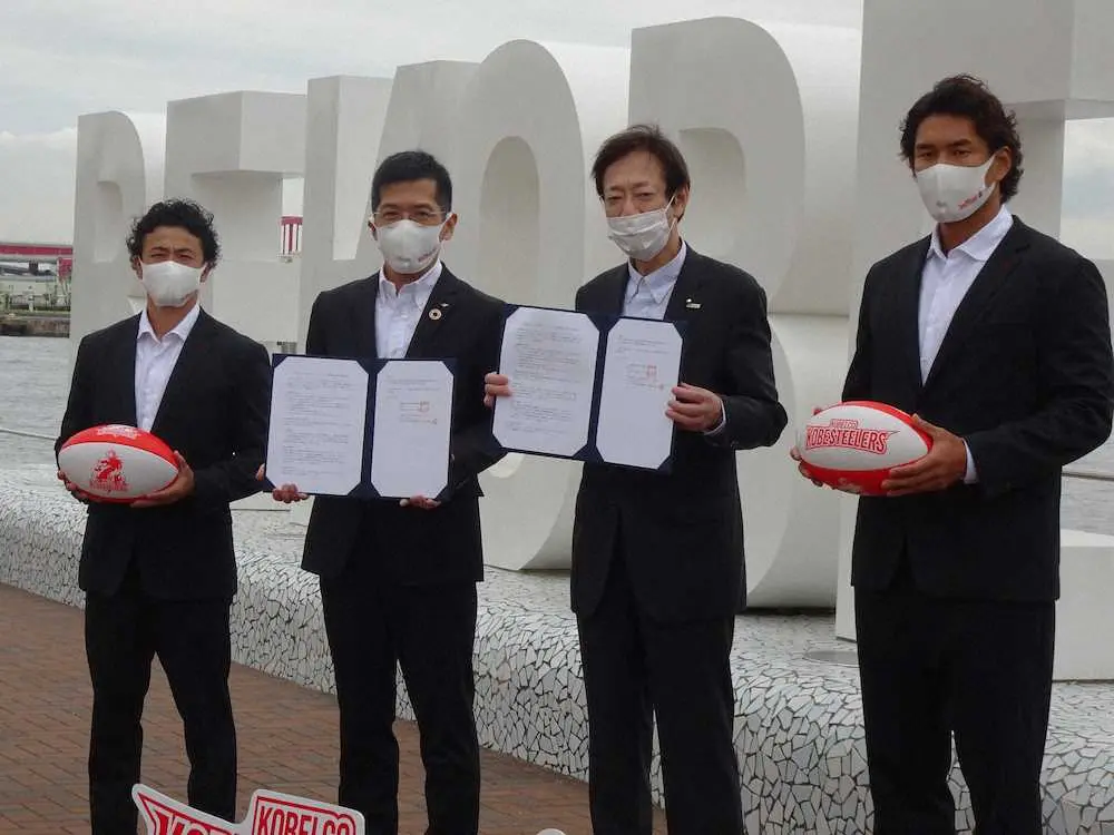 ラグビー新リーグ「リーグワン」1部のコベルコ神戸が28日、神戸市と事業連携協定を結び、神戸市内で締結式をした。両者はこれまでも小学校のタグラグビー教室、地域活性化事業などで協力してきた。今後も、市政のPR、ラグビー・アカデミーの推進など、様々な分野での結びつきを強めていく。