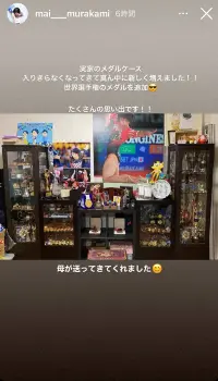 村上は「実家のメダルケース」「入りきらなくなってきて真ん中に新しく増えました!!」と数々のメダルやトロフィーが置かれている実家の部屋の写真を投稿した。