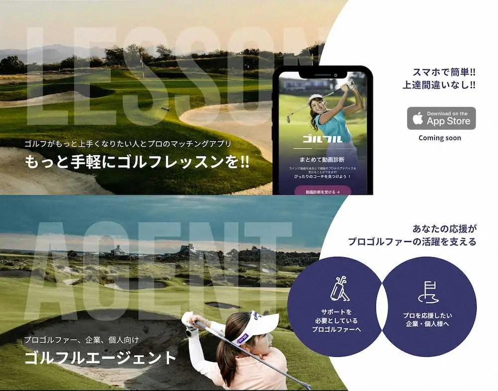 具体的に(1)は「一人で練習しても上手くならない」、「習いたいけど自分に合うコーチが分からない」、「場所や時間を問わず自分のタイミングでレッスンを受けたい」などの悩みを抱えるゴルファーが、ゴルフル登録のさまざまなプロからアプリで気軽に簡単にレッスンを受けられるサービスを展開する。