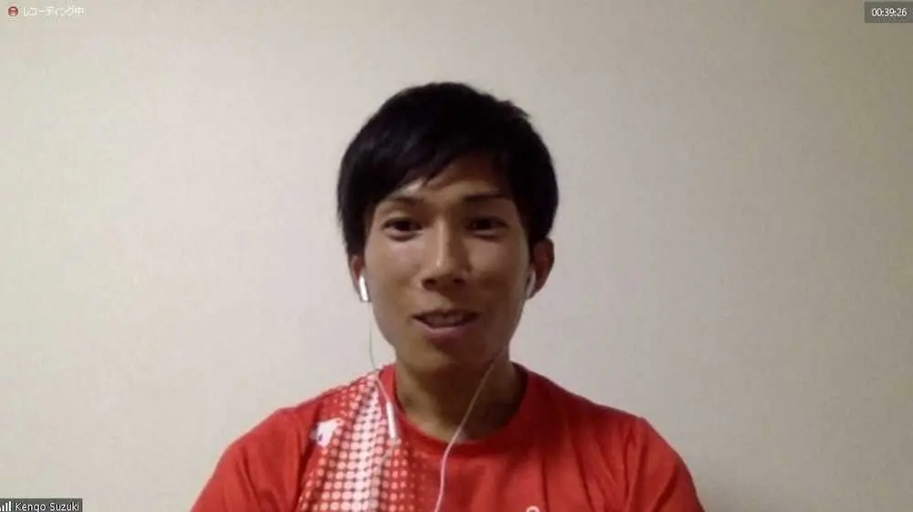 オンラインで取材に応じた男子マラソン日本記録保持者の鈴木健吾