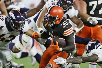 NFLは21日、オハイオ州クリーブランドで第7週の1試合を行い、エースQBのベイカー・メイフィールド(26)を左肩の骨折で欠いているブラウンズが、17―14(前半10―0)でブロンコスに競り勝って4勝3敗。3連敗を阻止し、ホームでは今季4戦で3勝目を挙げた。