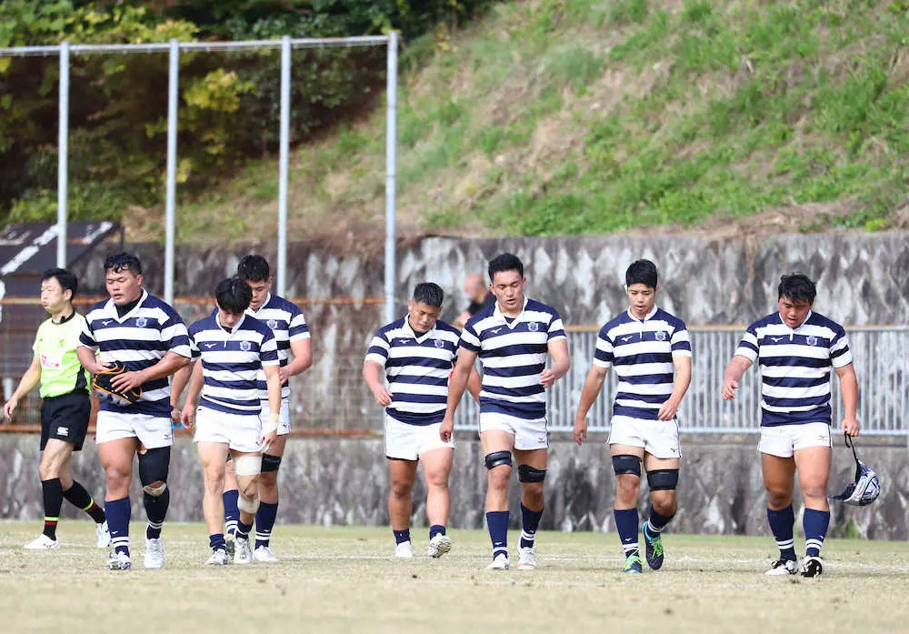<関大・京産大> 試合に敗れ、肩を落とす関大フィフティーン (撮影・後藤 大輝)