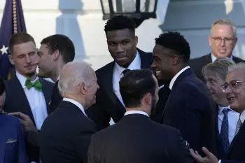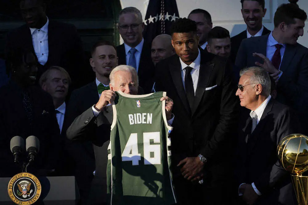 昨季のNBAファイナルで50シーズンぶりに優勝したバックス(本拠はウィスコンシン州ミルウォーキー)が8日、ホワイトハウスを表敬訪問。ファイナルでMVPとなったヤニス・アデトクンボ(26)がジョー・バイデン大統領(78)の前でスピーチし、バックス側からは第46代大統領にちなんで「46番」のユニフォームが贈られた。