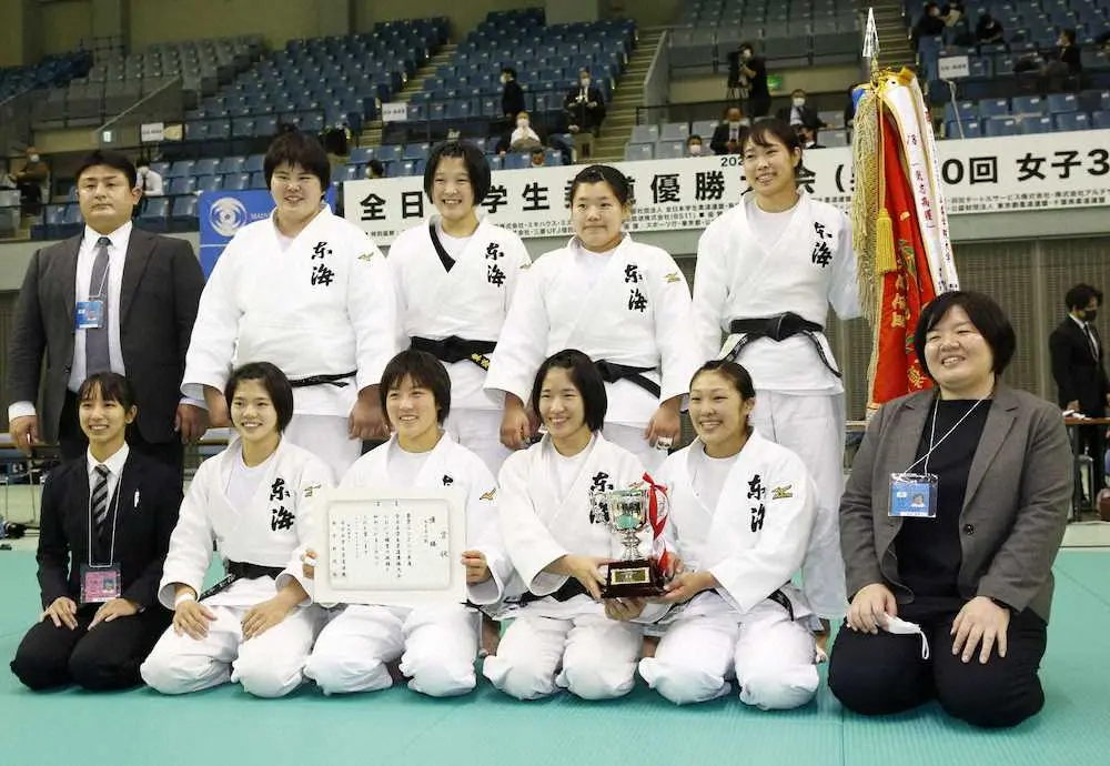 柔道全日本学生優勝大会女子5人制で優勝した東海大の選手ら。右端は塚田監督