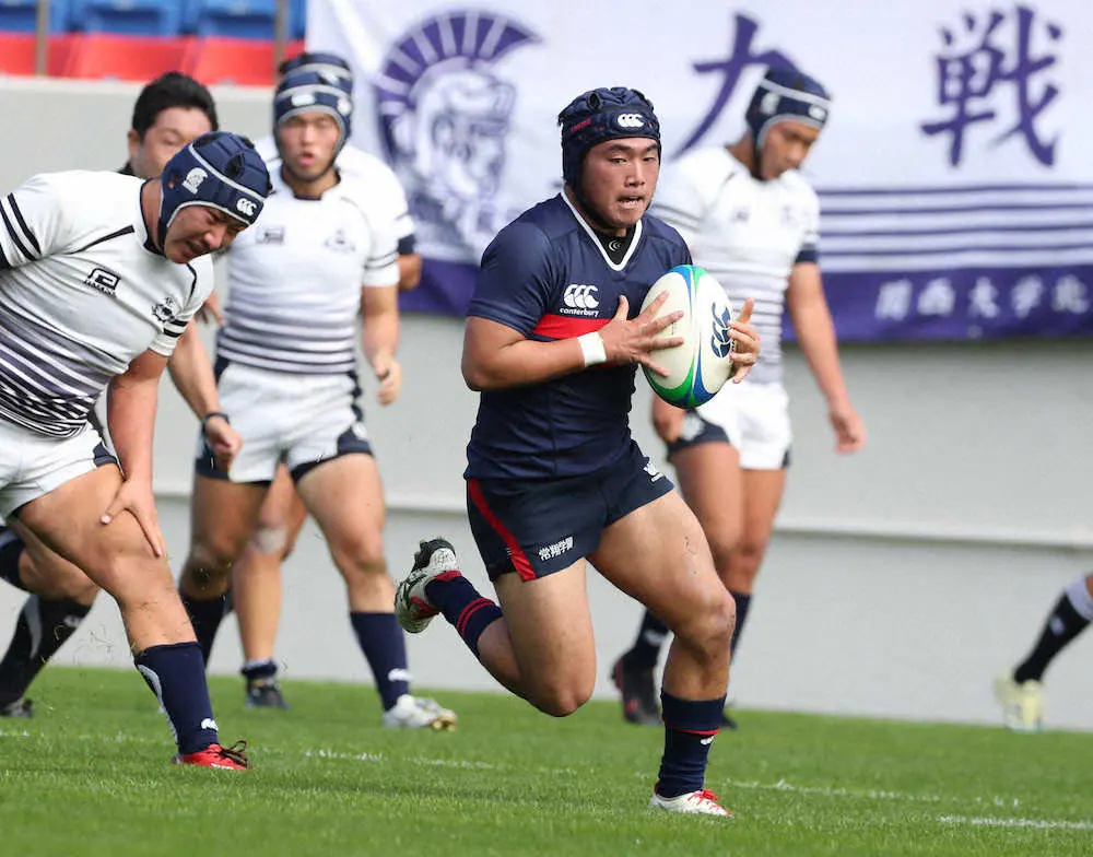 関大北陽の積極的なディフェンスに序盤は苦しんだものの、1年からレギュラーのSO仲間航太(3年)が巧みなゲームコントロールで状況を打開。7―0の前半18分、相手ディフェンスが1人飛び出したところを見逃さず、ほころびを突いて中央を大きく突破。FWも攻撃に加わってゴール前まで押し寄せると、ラストパスを受け取ってインゴールに抑えた。前半26分には、右サイドに顔を出して大外を破って2本目のトライを決めた。
